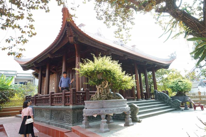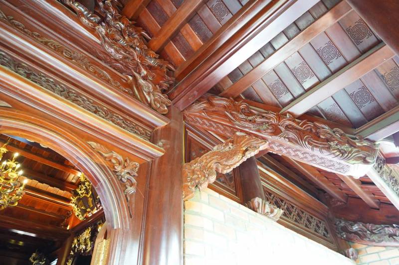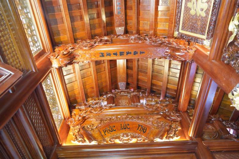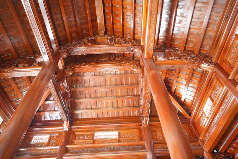 Ngôi từ đường được thiết kế 3 gian tiền đường và thêm một gian hậu cung phía sau, chất liệu chính là gỗ Căm xe có chọn lọc tỉ mỉ , kỹ càng không giác, không dập nứt và không chắp vá, đảm bảo chất lượng bền bỉ theo thời gian. Với kích thước 12 chiếc cột cái cao 460cm, đường kính 28cm. 14 chiếc cột quân cao 360cm với đường kính 26cm. Bên ngoài toàn bộ lan can làm bằng gỗ với hàng cột hiên, kẻ hiên con chồng được trạm khắc hoa lá tây và tứ quý tinh xảo. Cùng lối nhà mái đao cong vút mềm mại, bắt mắt càng tạo nên thêm nét đẹp cũng như sự bề thế hơn cho ngôi nhà. Phần lô cửa trên được đục tứ bình, chuyện thủng cả hai mặt, phần lô cửa dưới là phần gỗ đặc và đục họa tiết tứ quý cùng nhiều họa tiết hoa văn uốn lượn, tinh xảo.