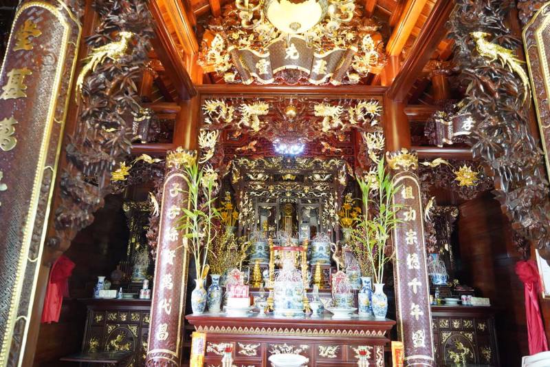 Khám phá bên trong căn nhà được sắp xếp với bố cục rõ ràng và chuẩn lối kiến trúc Bắc Bộ: những thanh xà, cửa võng, hoành phi, câu đối được trạm khắc tinh xảo, cầu kỳ, chi tiết với những hoa văn ý nghĩa. Tất cả đều toát lên được vẻ đẹp là sản phẩm, là tâm huyết của những đôi bàn tay tài hoa khéo léo của các nghệ nhân làm nghề mộc của nhà gỗ Lương Tựa. Hơn nữa ngôi từ đường được thiết kế 3 gian thêm gian hậu cung phía sau, để thuận tiện cho việc xắp xếp đồ dùng, dụng cụ, rất hợp lý cho việc bầy trí đồ thờ cúng tổ tiên, ba gian tiền đường để bài trí trường kỷ và bàn thờ phật, bàn thờ bác. Hai bên hông nhà được thiết kế bố trí thêm hai bộ của bức bàn. Giúp thuận tiện thoải hơn cho việc di chuyển và thoáng đãng hơn cho ngôi nhà.