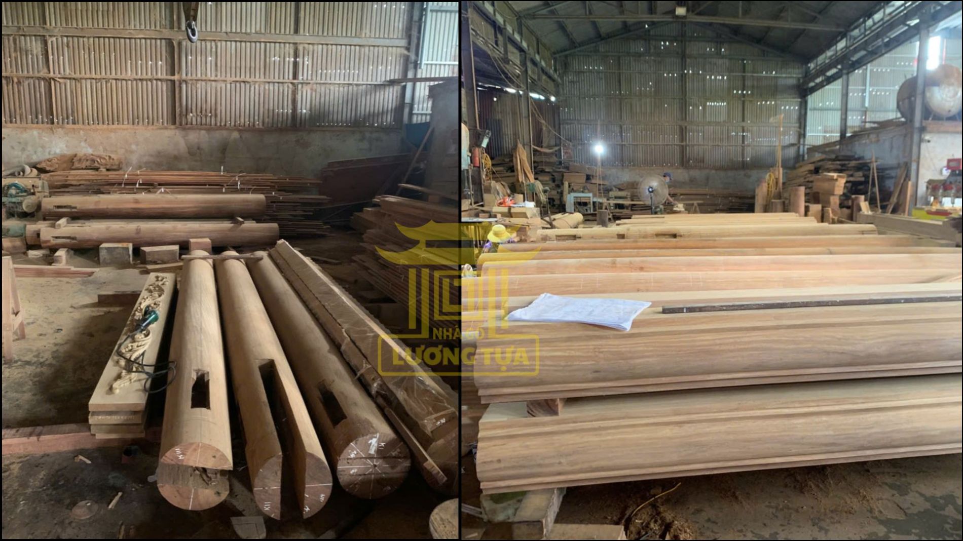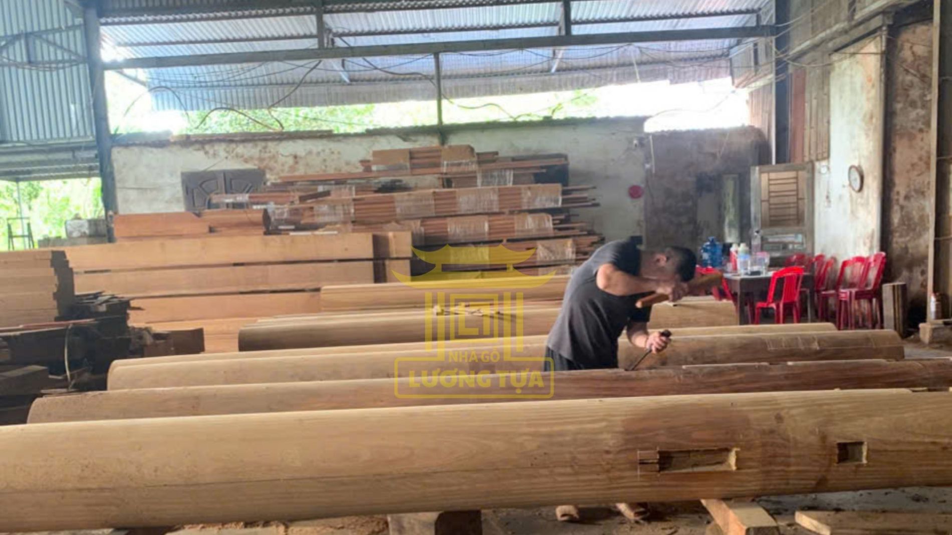 Từng cột gỗ được lựa chọn kỹ lưỡng từ phôi gỗ lim già, vân đều, sau đó được gia công chính xác từng chi tiết mộng – chốt – liên kết, đảm bảo tính chịu lực và thẩm mỹ cao.