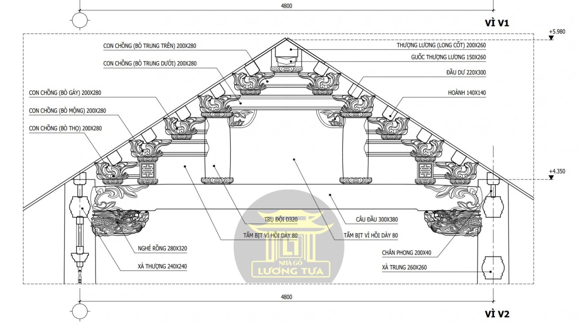 4 cây cột cái: Đường kính 40cm – Cao 4.23m