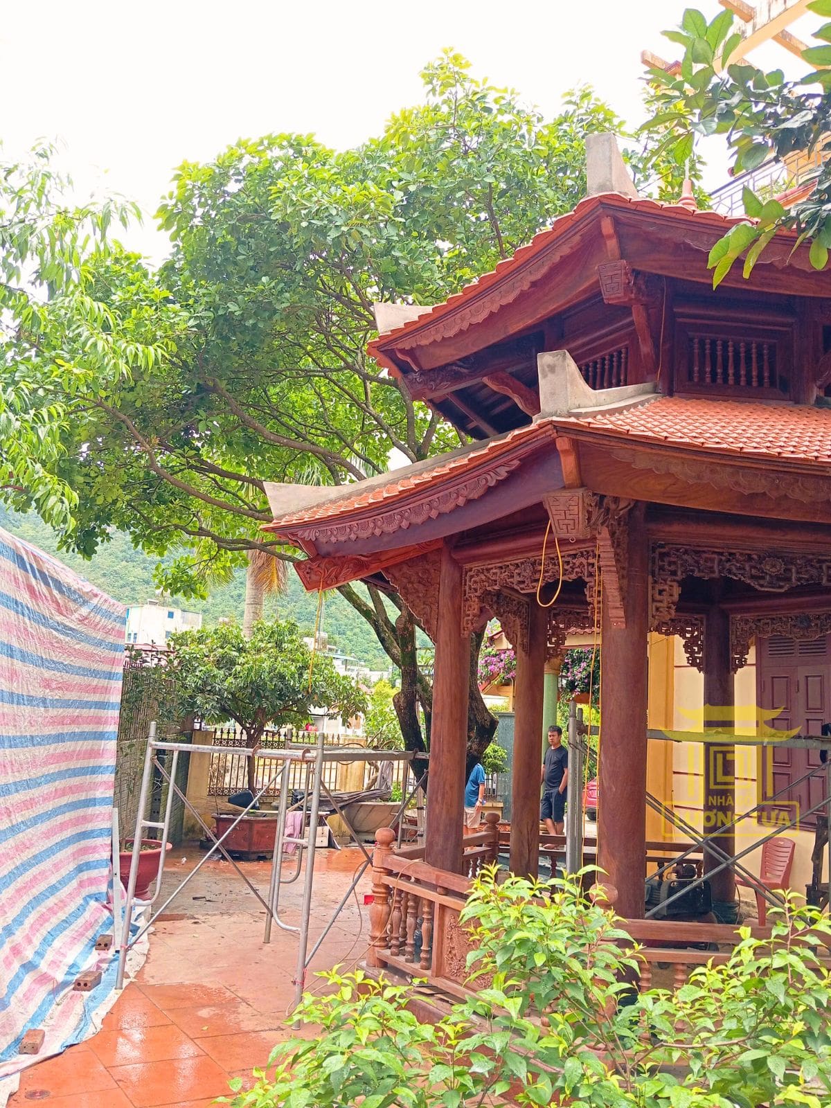 6 mặt cân xứng, mái chồng diêm cong vút, lan can gỗ tinh xảo, trụ – kèo – đấu đẹp mắt.