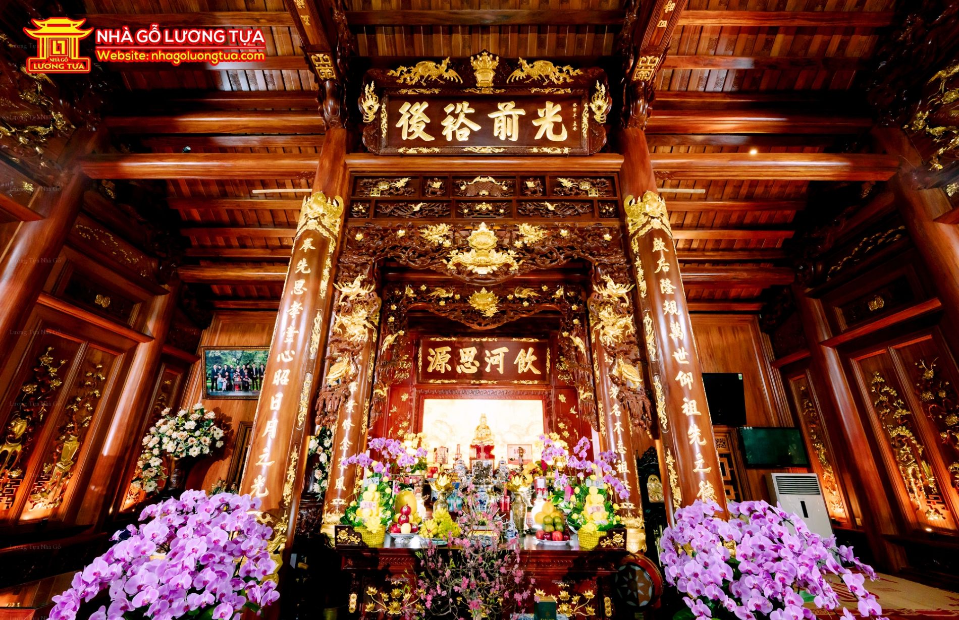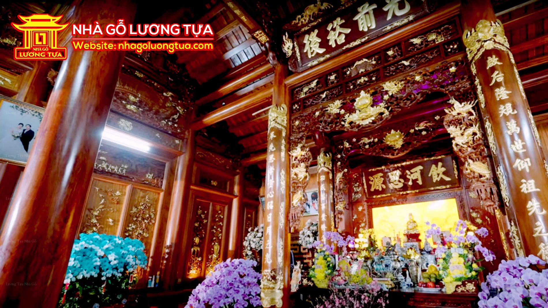 Khám phá bên trong căn nhà quý vị sẽ thấy choáng ngợp với nội thất tinh tế: gian giữa nhà rộng nhất và trang nghiêm nhất được sử dụng làm không gian thờ tự.. không thể thiếu những thanh xà, cuốn thư, câu đối cửa võng đục trạm tinh xảo và đều được sơn son thiếp vàng đẹp mắt. Các mẫu hoa văn hoa hồng chim trĩ, tứ linh đục triện, tứ quý, kết hợp cùng câu đối chữ Hán nôm - mang ý nghĩ giáo dục con cháu và cầu mong những điều tốt đẹp nhất cho gia đình.