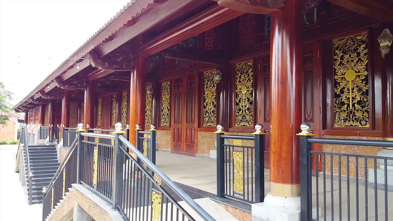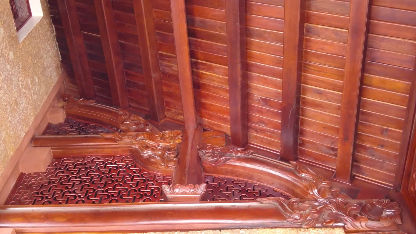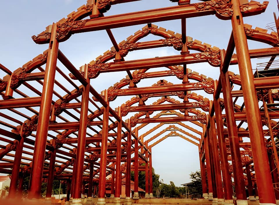Công trình gây ấn tượng với quy mô lớn, thiết kế theo phong cách chồng diêm cổ điển, sử dụng toàn bộ chất liệu gỗ gõ mật nhập khẩu cao cấp – loại gỗ quý nổi tiếng bởi độ bền, vân gỗ đẹp và khả năng chống mối mọt ưu việt. Hệ thống khung gỗ đồ sộ gồm: