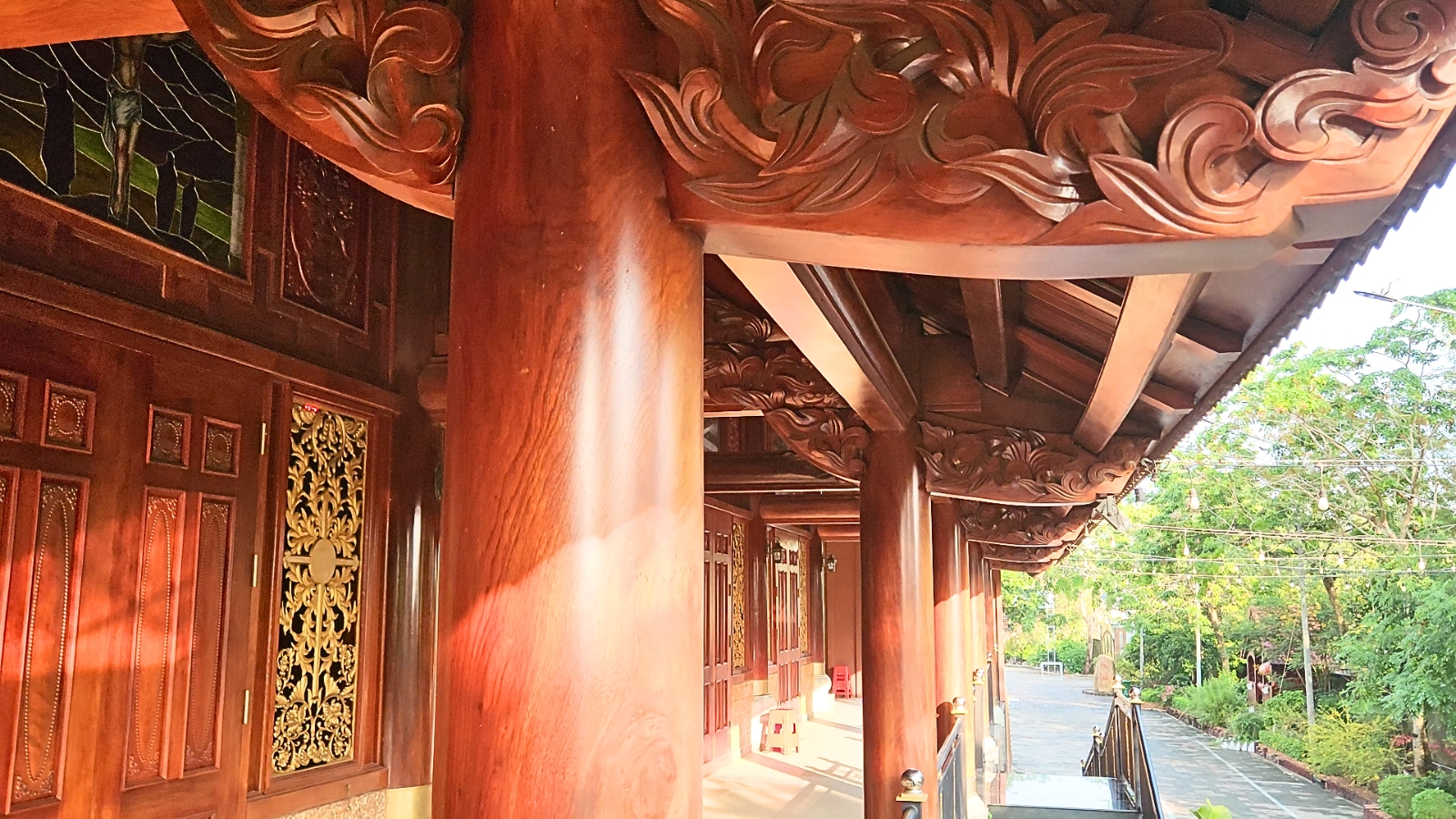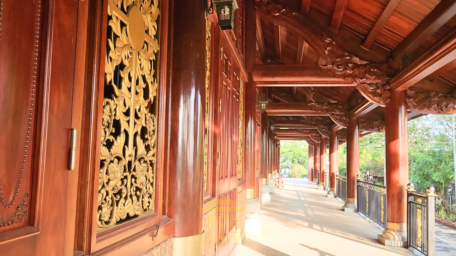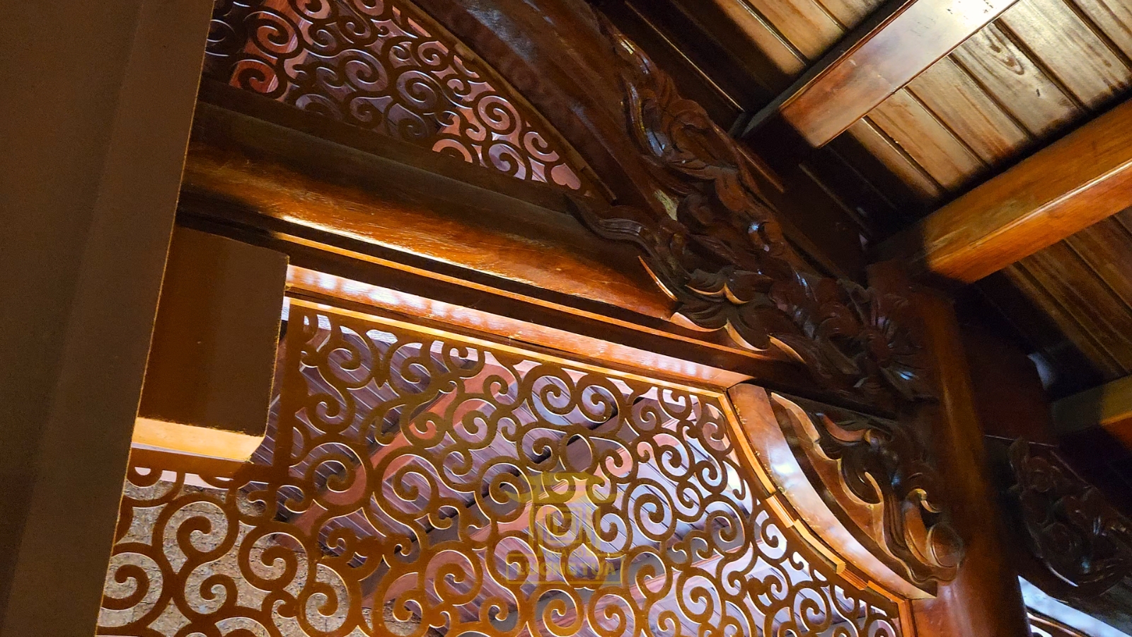 Công trình gây ấn tượng với quy mô lớn, thiết kế theo phong cách chồng diêm cổ điển, sử dụng toàn bộ chất liệu gỗ gõ mật nhập khẩu cao cấp – loại gỗ quý nổi tiếng bởi độ bền, vân gỗ đẹp và khả năng chống mối mọt ưu việt. Hệ thống khung gỗ đồ sộ gồm: