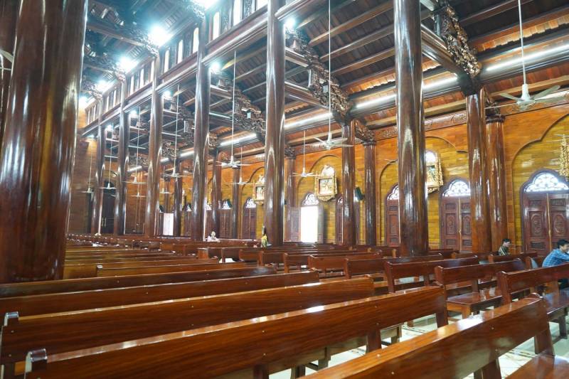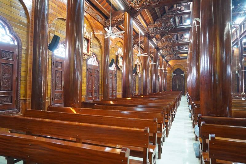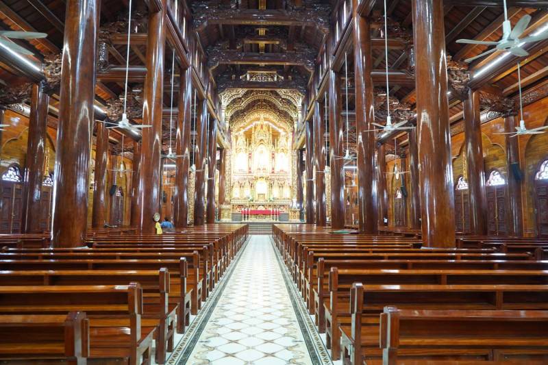 Nhìn từ cuối nhà thờ, điểm thu hút nhất là bộ cửa chính, hai bên cửa phụ đều được trạm khắc hoa văn, họa tiết theo lối của người công giáo. Bước vào bên trong ngôi thánh đường chúng ta sẽ bị choáng ngợp bởi toàn bộ nội thất làm bằng gỗ với tổng số gỗ khoảng 1.300 m3 gỗ lim nam phi. Những cây cột được trải dài khắp nhà thờ, với hệ thống 10 vì kèo, 4 hàng cột, trong đó hai hàng cột chính là 20 chiếc cột cái có chiều cao 11m, hai hàng cột bên hông cao 6m, chia làm 11 gian làm cho không gian nơi đây vô cùng thoáng đãng. Đường kính các cột giảm dần làm tăng thêm độ sâu thẳm cho ngôi thánh đường. Nhìn từ cuối nhà thờ lên điện thánh những bộ vì kèo, con chồng ruờng có đục trạm hoa văn vô cùng cầu kỳ đẹp mắt và cuốn hút người xem.